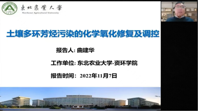 11月7日,曲建华在“中国土壤学会2022年优秀青年学术报告”会中,做了题为《土壤多环芳烃污染的化学-生物耦合修复及调控》的学术分享。他针对我国土壤多环芳烃污染严重,而缺乏有效修复技术的瓶颈,创新性地提出了基于环糊精调控的化学氧化耦合微生物修复技术体系,实现了对土壤中苯并芘高效且低成本的降解,为我国土壤污染修复技术的发展提供了新思路。