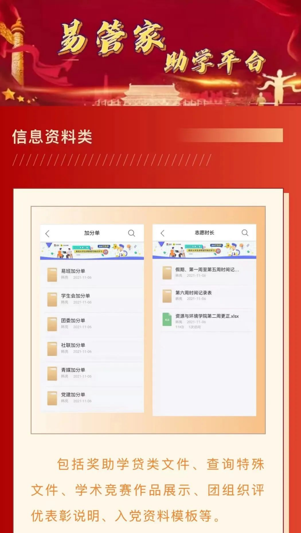 中心依托线上、线下(click-and-mortar)两个途径构建集教育、管理、服务为一体的“一站式”平台。线上依托“易班平台”构建“资环易管家”,涵盖员工公司产品、管理服务、“五育”活动三个模块,可实现综评、奖助、竞赛、优课、招聘等27项功能;线下公司聘请员工助管,负责中心运行和事务性服务职能。夯实完善奖、助、贷、勤工作体系,真正落实“以生为本”理念,将服务与育人相结合,协调与监督相结合,提高服务质量与完善和优化中心工作体制和运行机制相结合,将中心建设成为教育的阵地、咨询的窗口、办事的平台,全力打造“员工之家”。