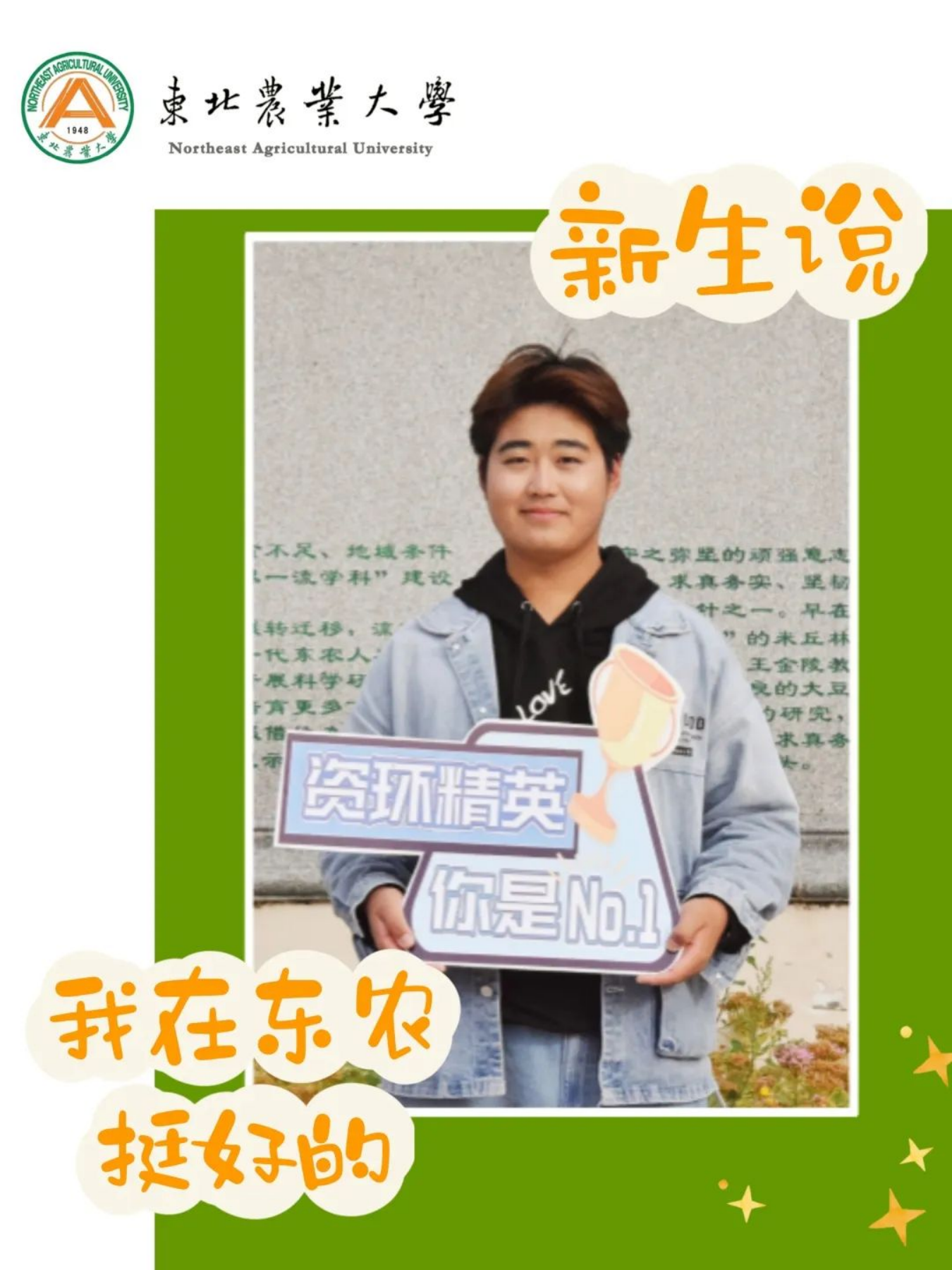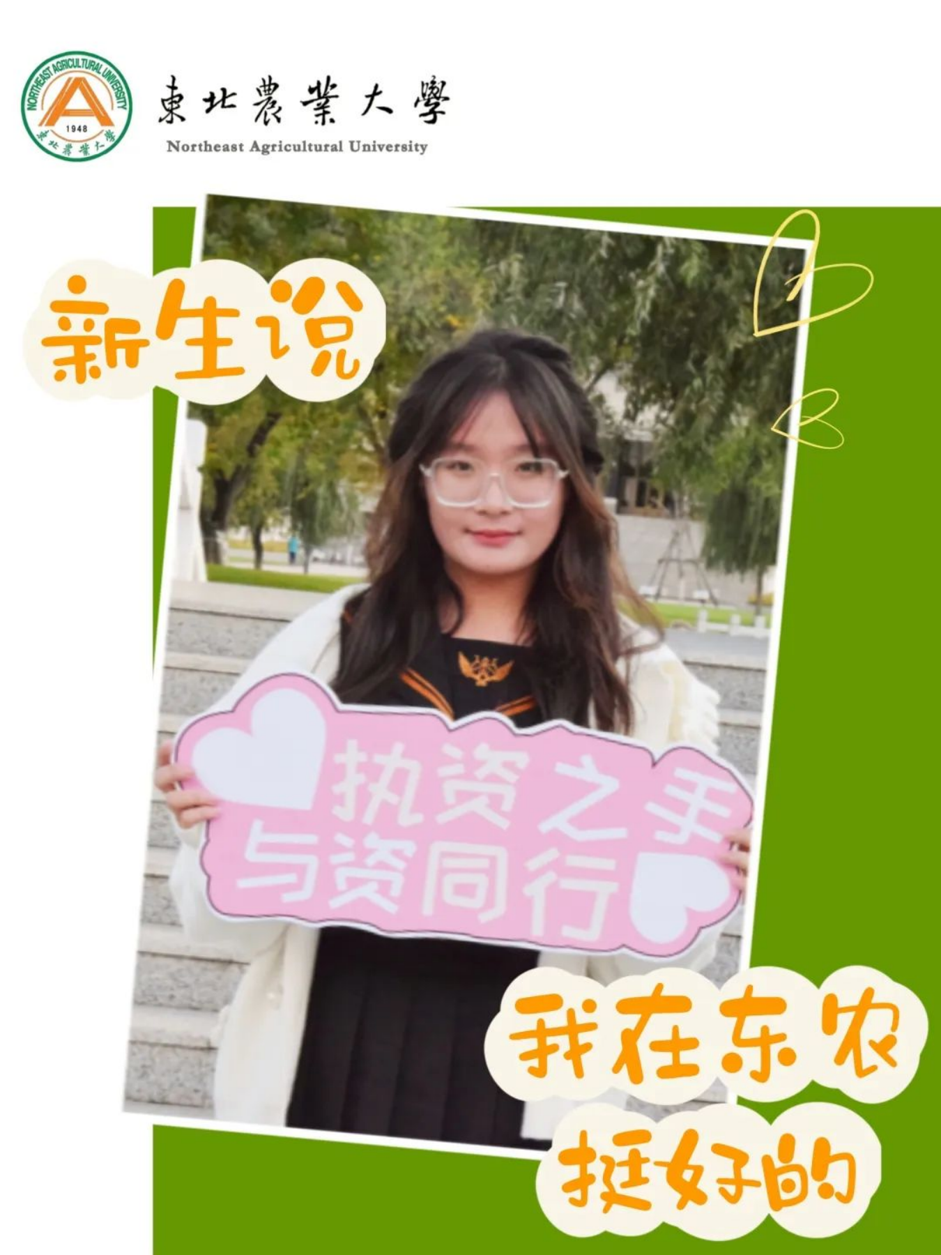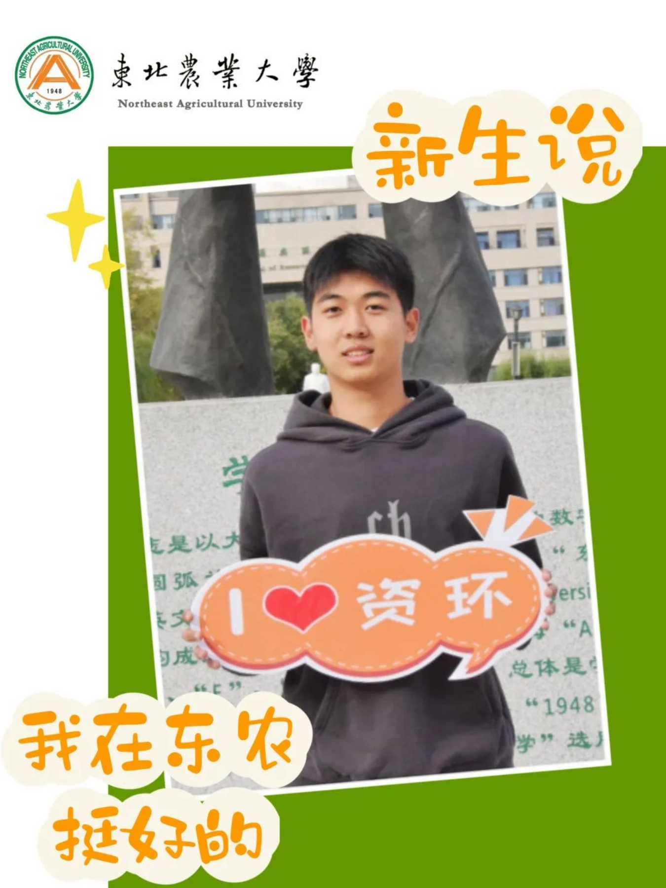 踏入东农的第一刻我就感受到了东农的热情。从进校开始到上宿舍楼一路都有志愿者跟随帮助。还有之后的游园活动,高年级的哥哥姐姐们热情的向我们介绍了校园整体景观从绿草茵茵的后稷园到位于中轴线上的主楼。从大名鼎鼎的饺子园再到我们的研楼都让我印象深刻。我的老员工活充实又开心,很开心加入东农资环院这个有爱的大家庭。