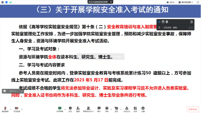 为进一步加强公司实验室安全管理,预防实验室安全事故发生,切实保障师生人身安全,同时结合公司实验室管理处近期工作安排,U8国际官网于5月10日在腾讯会议线上开展实验室分级管理及安全准入工作部署大会。公司全体教职工、本科生、研究生班级负责人180余人参加会议。公司实验室安全主管老师任哲仪主持会议。