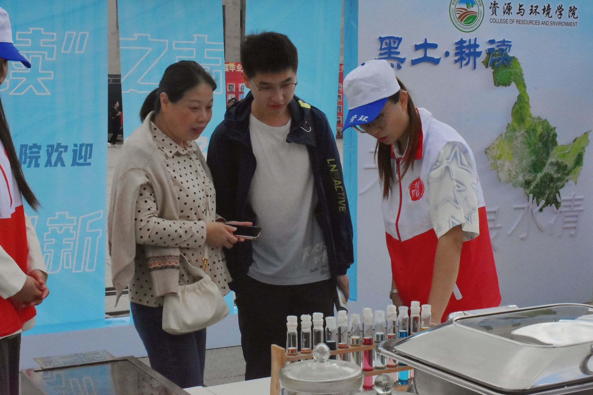 迎新现场,涵盖U8国际官网简介、学科介绍、“六分仪”辅导员工作室等6张“旋转式”彰显资环全面工作的宣传板逐一排开,志愿者们细心为家长和新生讲解;土壤标本、气象观测仪、实验试剂、菌类美食等代表专业特色的展品吸引诸多咨询者,让迎新现场成为了最好的“开学第一课”;印有“启梦‘耕读’之志 资环‘新心’向农”的“镂空式”合影墙把资环人传承“耕读精神”的情怀展现的淋漓尽致,新生们积极同父母、老师、朋友合影留念;公司创新理念采用专业魅力打造迎新现场,号召新同学从祖国各地携家乡土样瓶而来,并将实验基础大楼作为迎新打卡参观点,助力员工深入了解、喜爱所学专业,做到迎新有“志”。