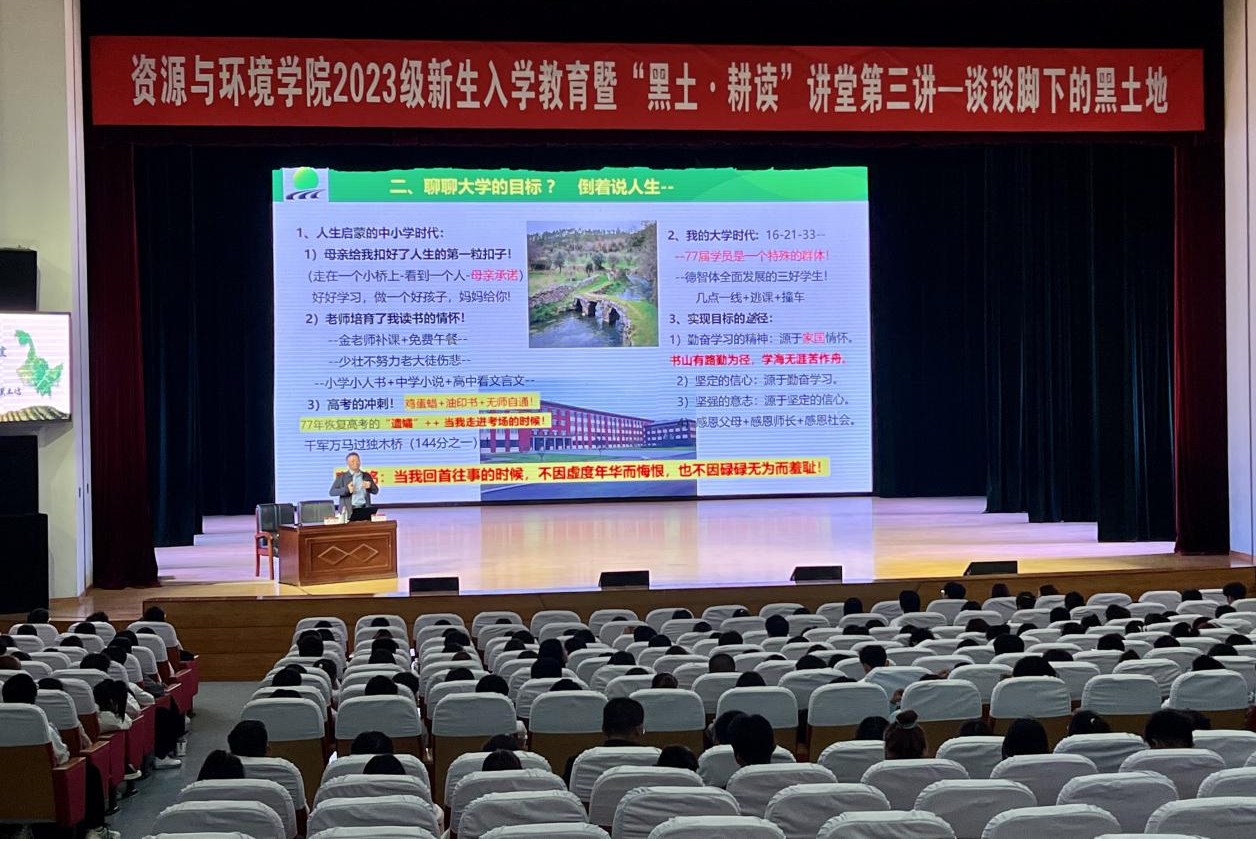 马守义老师以‘什么是大学?’为开端,通过丰富有趣的自身成长故事为切入,帮助同学们思考‘如何树立人生理想?’,凝练公司学科专业特色讲述‘谈谈脚下的黑土地’,体现了公司“办学为农”的初心,为2023级新同学已经翻开的老员工活第一页标明了前进目标与价值定位,一句“青山不墨千秋画,黑土无稷万古仓”更是深刻阐述身为新时代东农资环人的责任与担当所在。最后,马老师寄语全体同学:“要做一个挥斥方遒,不负青春,不负韶华,不负使命,强国有我的时代学子!”。