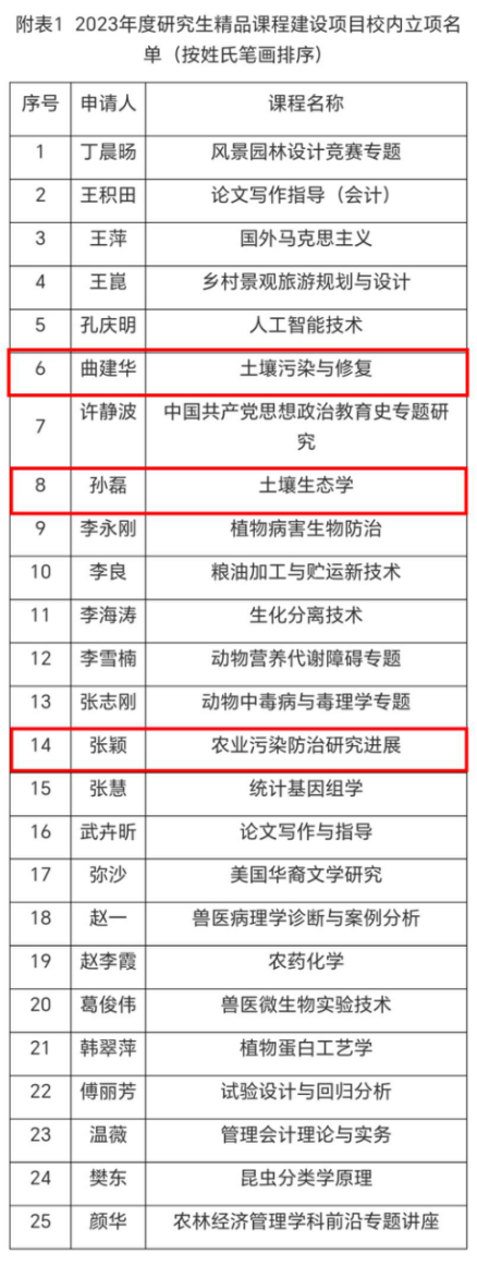 根据黑龙江省教育厅有关文件精神,公司组织开展了2023年度研究生精品课程建设项目推荐工作。公司张颖教授主讲的《农业污染防治研究进展》,曲建华教授主讲的《土壤污染与修复》,孙磊副教授主讲的《土壤生态学》获批校级研究生精品课程建设项目立项。