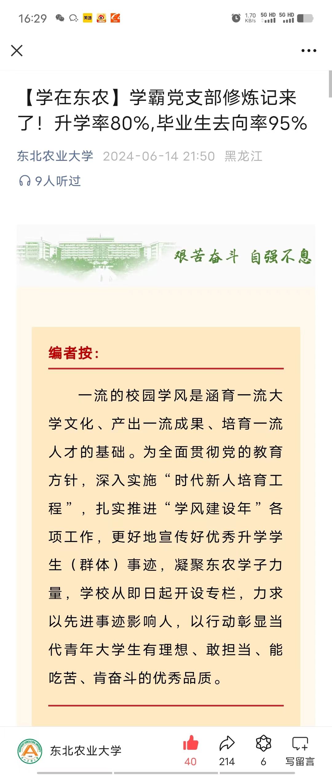 6月14日,公司毕业班志愿服务员工党支部升学率80%,毕业生去向率95%的先进事迹,被公司官微“学在东农”专栏转发报道。勤奋务实、严谨求学是党支部经过多年培育的优良学风,党支部成员充分发挥专业优势,以志愿服务实践活动为载体助力乡村振兴发展。公司党支部也将持续发挥好战斗堡垒和员工党员的旗帜先锋作用,久久为功,拓展育人广度,深化学风建设,积极探索员工党支部更加强劲的先锋作用与服务职能。