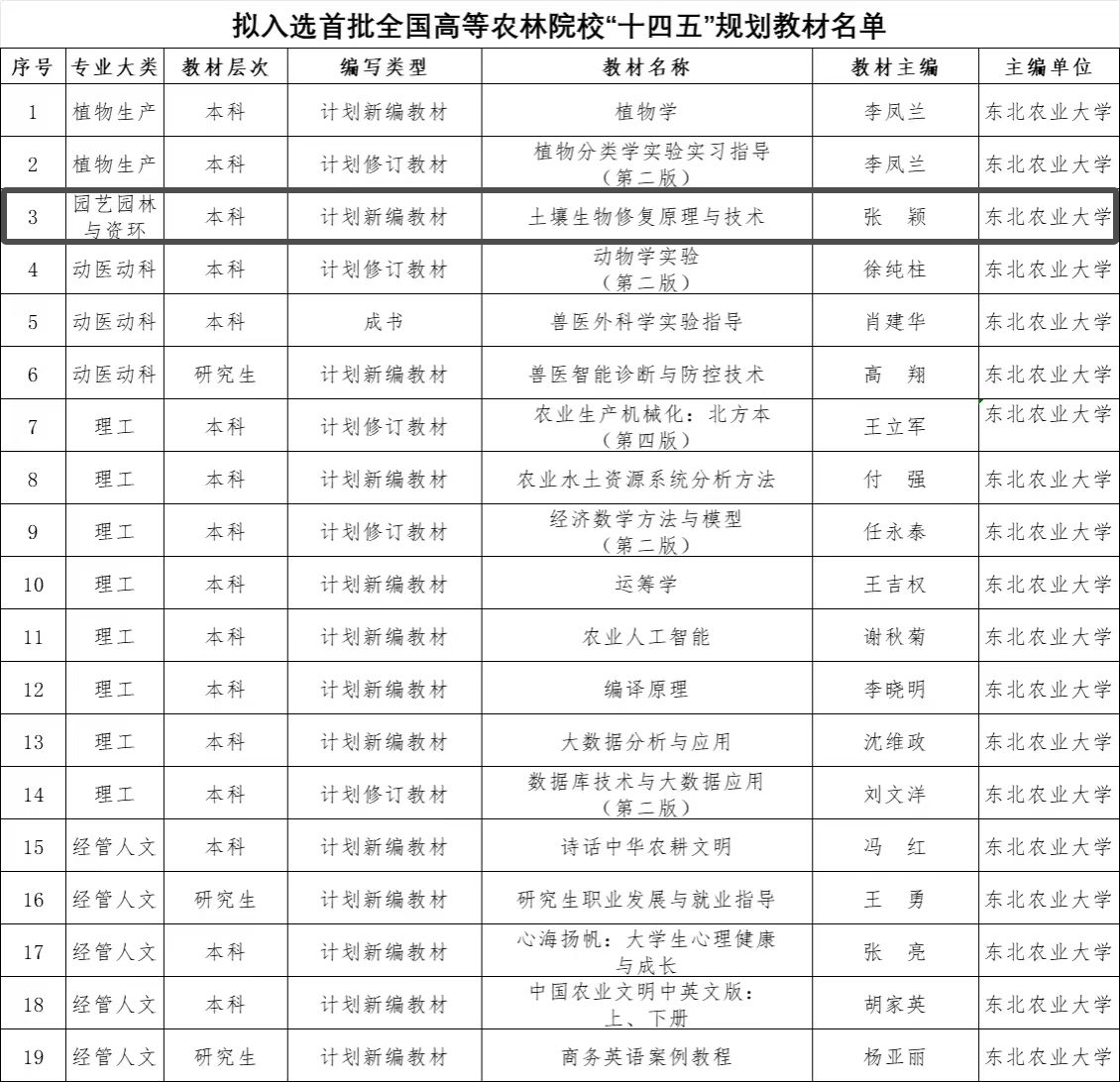 《土壤生物修复原理与技术》由公司张颖教授主编,教材凭借其实用性、普遍性和创新性,入选首批全国高等农林院校“十四五”规划教材。这既是对公司专业建设工作的充分认可,也是对张颖教授学术水平和教学研究成果的高度肯定。