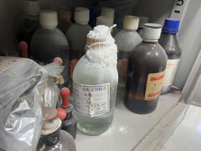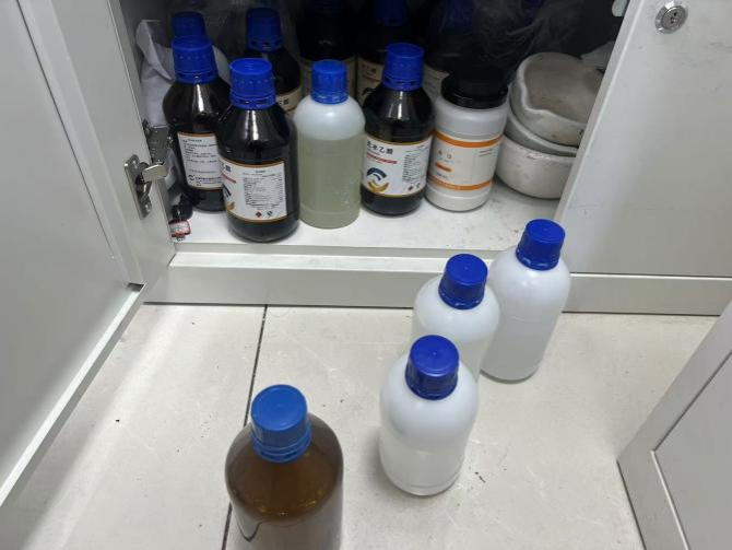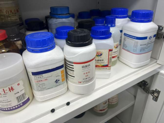 1、药品柜内存放无标签试剂、自配试剂未及时处理(张娟组)。 2、药品柜内存放无标签试剂(邵慧组)。 3、违规存放易制爆化学品-硝酸钠、试剂标签破损,无法辨认化学品名称(姜佰文组)。 4、实验室卫生混乱。 |