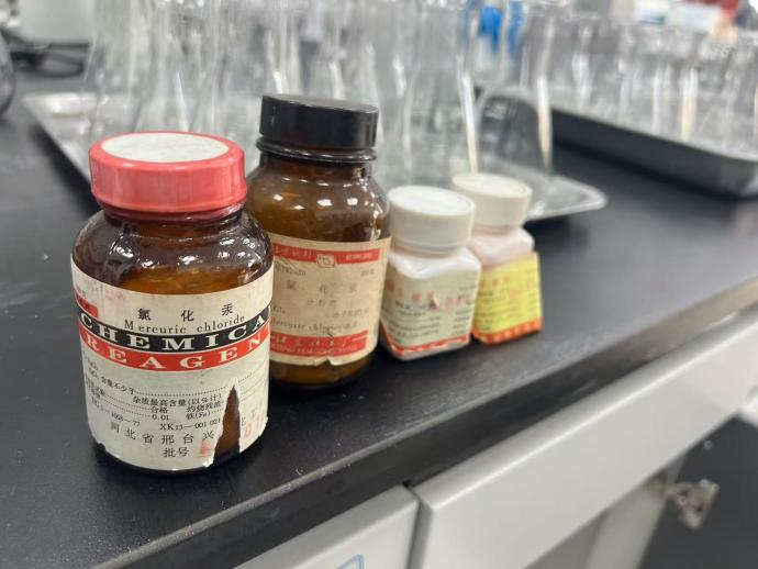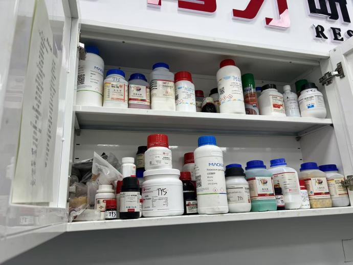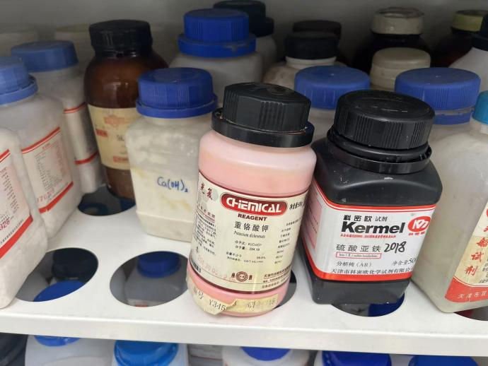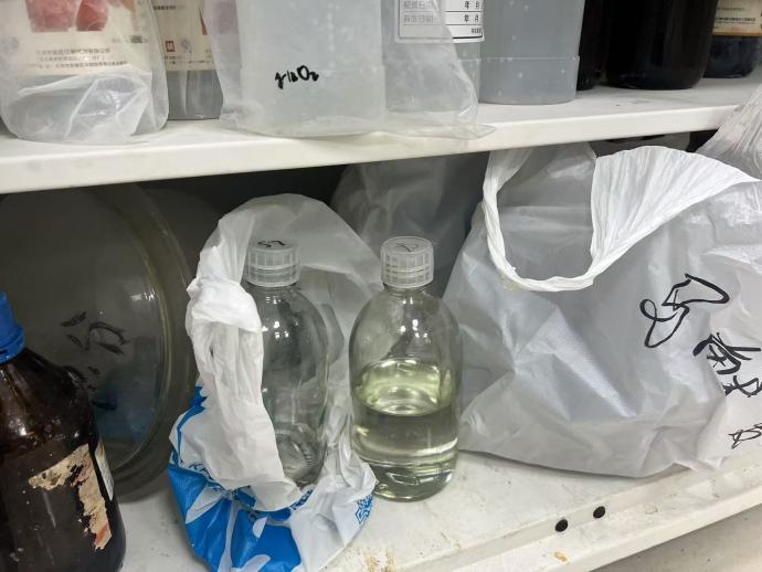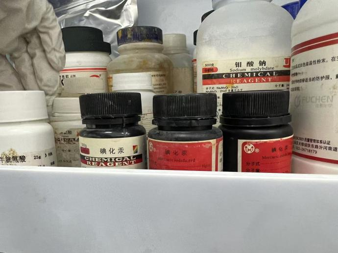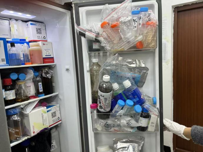 1、冰箱内实验物品摆放混乱。 2、插排置于地上、未离地30cm以上。 3、违规存放易制爆化学品-重铬酸钾、2,4-二硝基酚。 4、违规存放剧毒化学品-氯化汞。 5、药品柜未配置MSDS。 6、药品柜内存放大量无标签试剂。 |