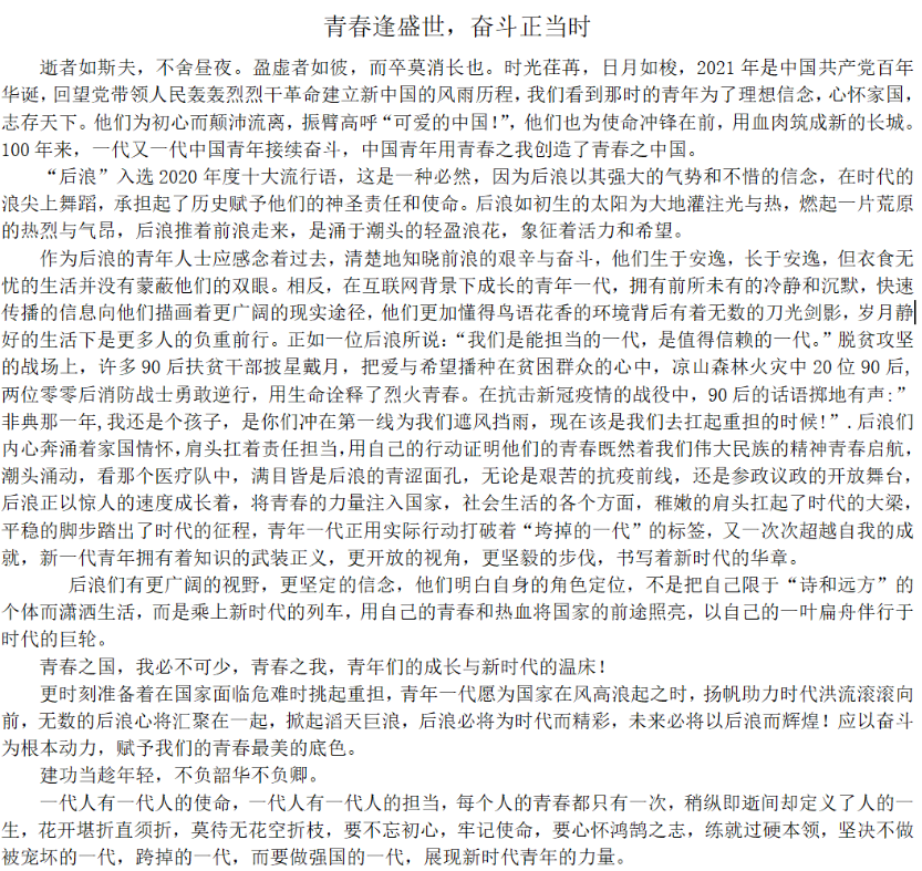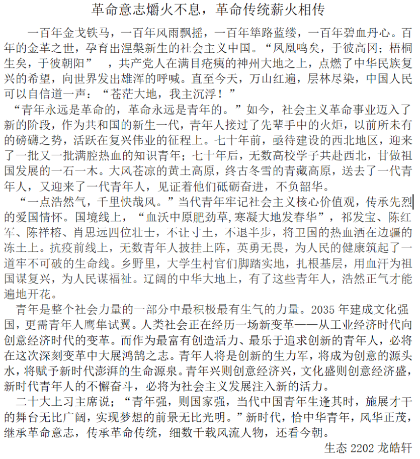 赓续百年薪火,砥砺岁月奋行。通过此次活动我们深刻明白没有中国共产党,就没有新中国,作为新时代的少年,我们应当勇于承担时代新使命,将个人奋斗叠加为国家发展合力,在追梦圆梦的道路上实现“个人梦”与“中国梦”同频共振!“乘风好去,长空万里,直下看山河。”未来属于青年,希望寄予青年,中华民族伟大复兴的中国梦终将在一代代青年的接力奋斗中变为现实。迈步在新时代的征程上,始终发扬艰苦奋斗的优良作风,落实到一点一滴的行动之中,从而汇聚起奋勇向前的强大正能量。