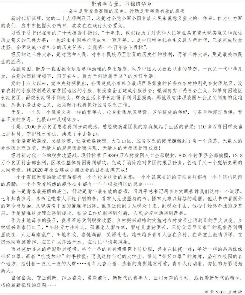 宏伟的蓝图已然展开,为学习宣传党的二十大精神,在青年群体中厚植爱党、爱国、爱社会主义的情感,牢记习近平总书记对青年工作的要求,U8国际官网易班工作站开展了“聚青年力量,书锦绣华章”主题征文活动。