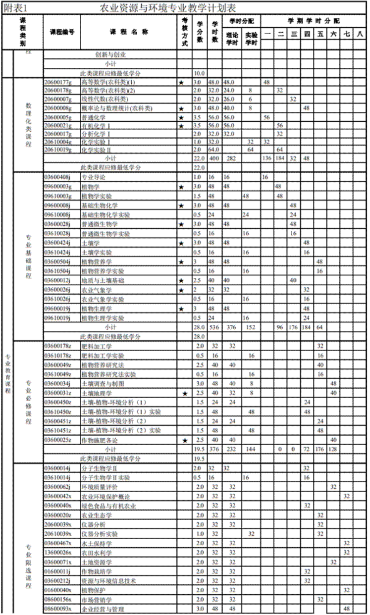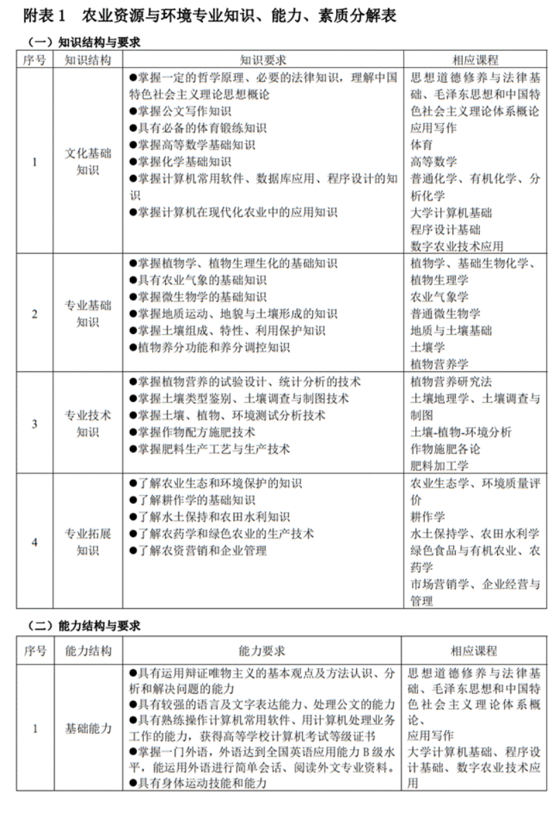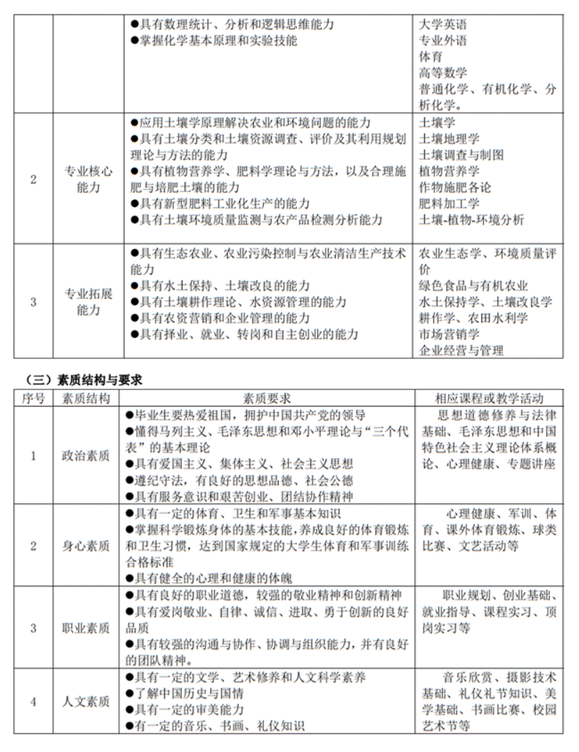 培养具有扎实的农学、地学、化学、生物学及管理学基础和良好创新意识,掌握农业资源与环境科学方面的基本理论、基本知识和基本技能,能够在农业、林业、水利、环保、国土资源等部门和单位从事土壤与肥料、资源管理、环境保护、生态建设方面的教学、科研、技术开发与推广、相关管理工作的高素质应用技术人才。