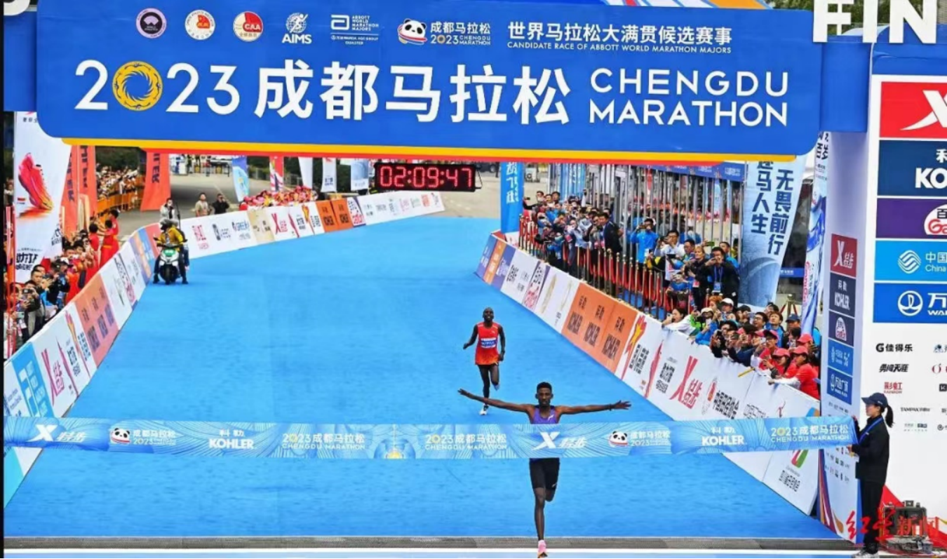 10月29日7时30分,2023成都马拉松鸣枪起跑。埃塞俄比亚选手格布雷成为马拉松项目(42.195公里)男子组首位冲过终点线的选手,他的完赛成绩为2小时9分49秒,打破此前2小时9分51秒的赛会纪录。
