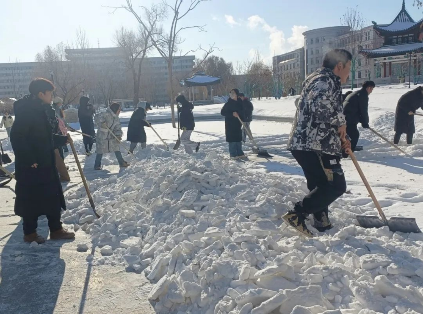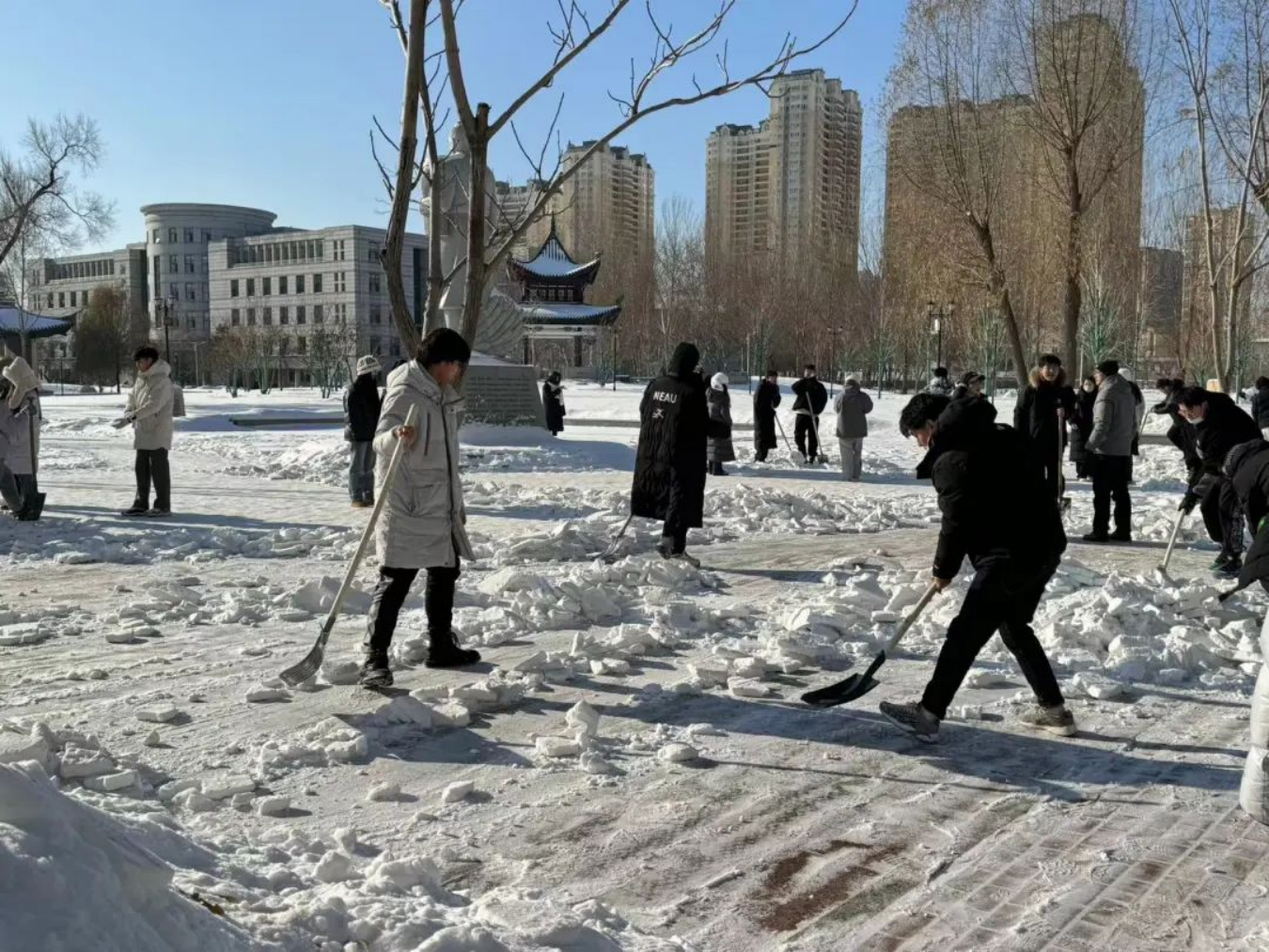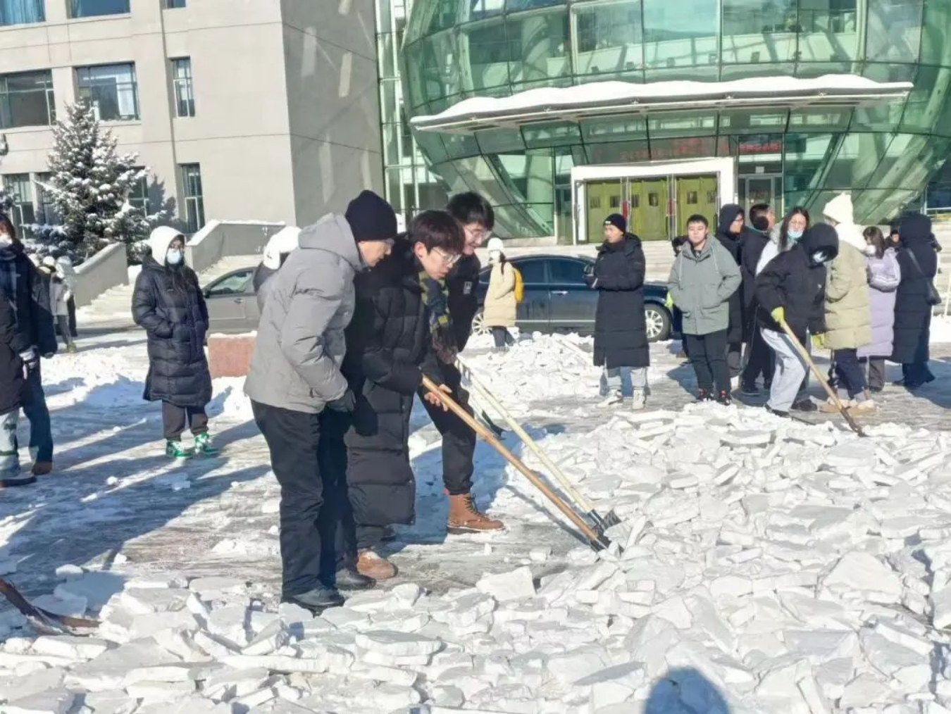 寒风里,老师和员工拿起工具加入到这场轰轰烈烈的清冰雪行动中,大家都不畏严寒、积极参与,早早的来到了清雪路段,分工合作、配合默契,热火朝天地挥舞铁锹、雪铲、扫把等工具进行清理。铁锹与地面的摩擦声,混合着扫帚的沙沙声,奏响了一曲“冬日协奏曲”。在师生的共同努力下,截至目前,公司研楼四周的主干路,后稷园广场内的积雪已基本清理干净,极大地保障了同学们的日常上课通行。