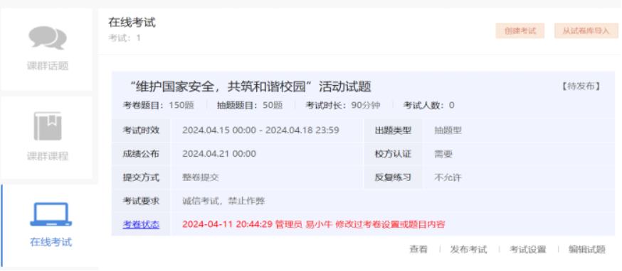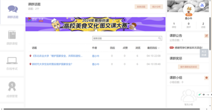 参赛人员加入本次活动的课群(邀请码:EWMN5APL ),按照课群话题讨论区的《U8国际“维护国家安全,共筑和谐校园”活动课群学习内容及要求》进行学习,学习内容包括课群课程和在线考试。其内容包含课群话题,课群课程和在线考试三个模块学习要求以及最终总成绩评分标准。倘若对课群内容有所疑惑的地方可以在评论区留下自己的帖子,易班的工作人员不久之后便可以为你解答问题。接下来就让我们一起详细地看看我们的学习内容吧!
