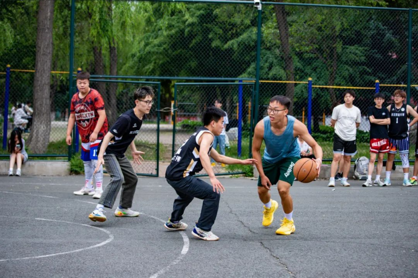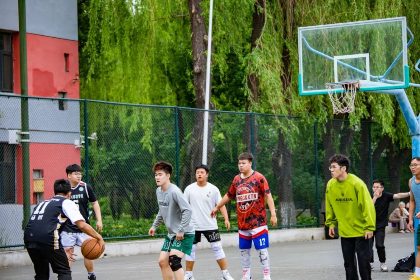 雄赳赳,气昂昂,弯下腰进攻防守,眼中充满战意,篮球队成员在阳光与微风的见证下开始了这场精彩的球赛。