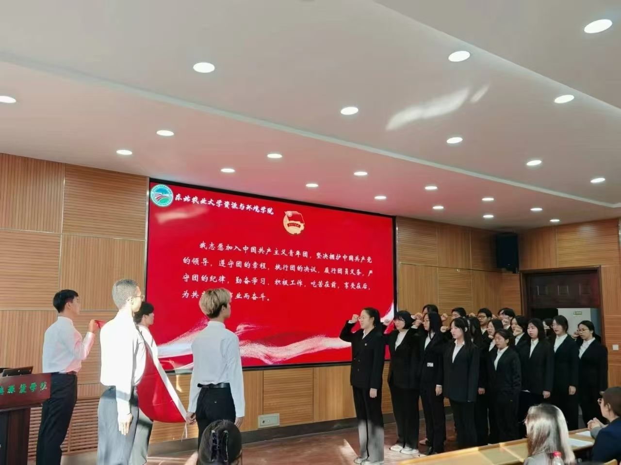 全体新团员面对团旗进行了庄严的入团宣誓,曹瀚月同学作为领誓人带领新团员进行宣誓。