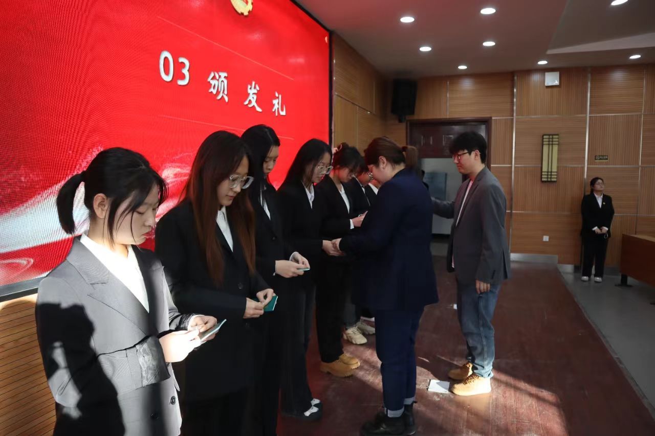 陈帅老师和苏美英男老师一起为新团员佩戴团徽,颁发团员证。