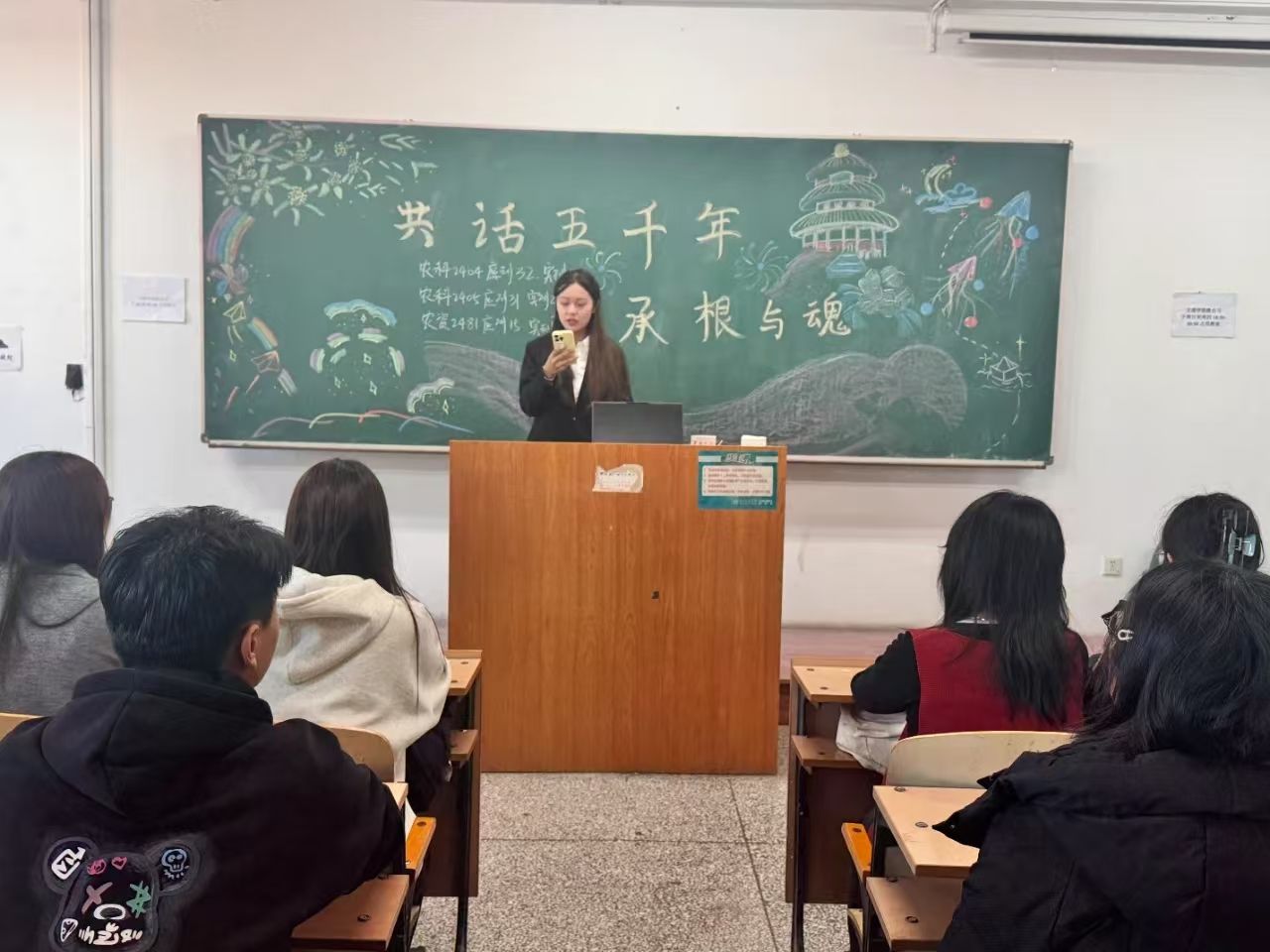 农科班级的主持人为同学们讲述了优秀传统文化起源,并展开讲述我国汉字、历法等方面的优秀文化印记,而且告诉同学们中华漫长历史长河中,传承优秀文化的困难和阻碍。最后告诉同学们:“我国是一个历史悠久的古国,在历史的长河中沉淀出许许多多优秀的传统文化,这是我们文化自信的来源,我们需要传承并弘扬我们的优秀传统文化,才可以让我们的文明之河源远流长。”向我们阐述传承传统文化的重要性。