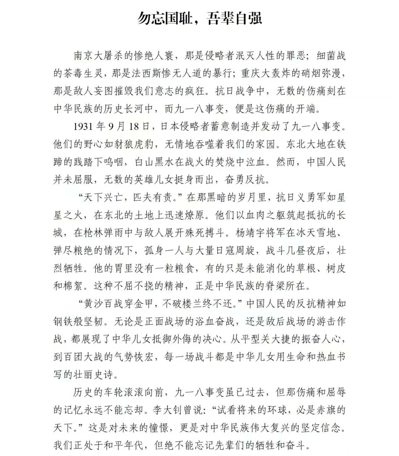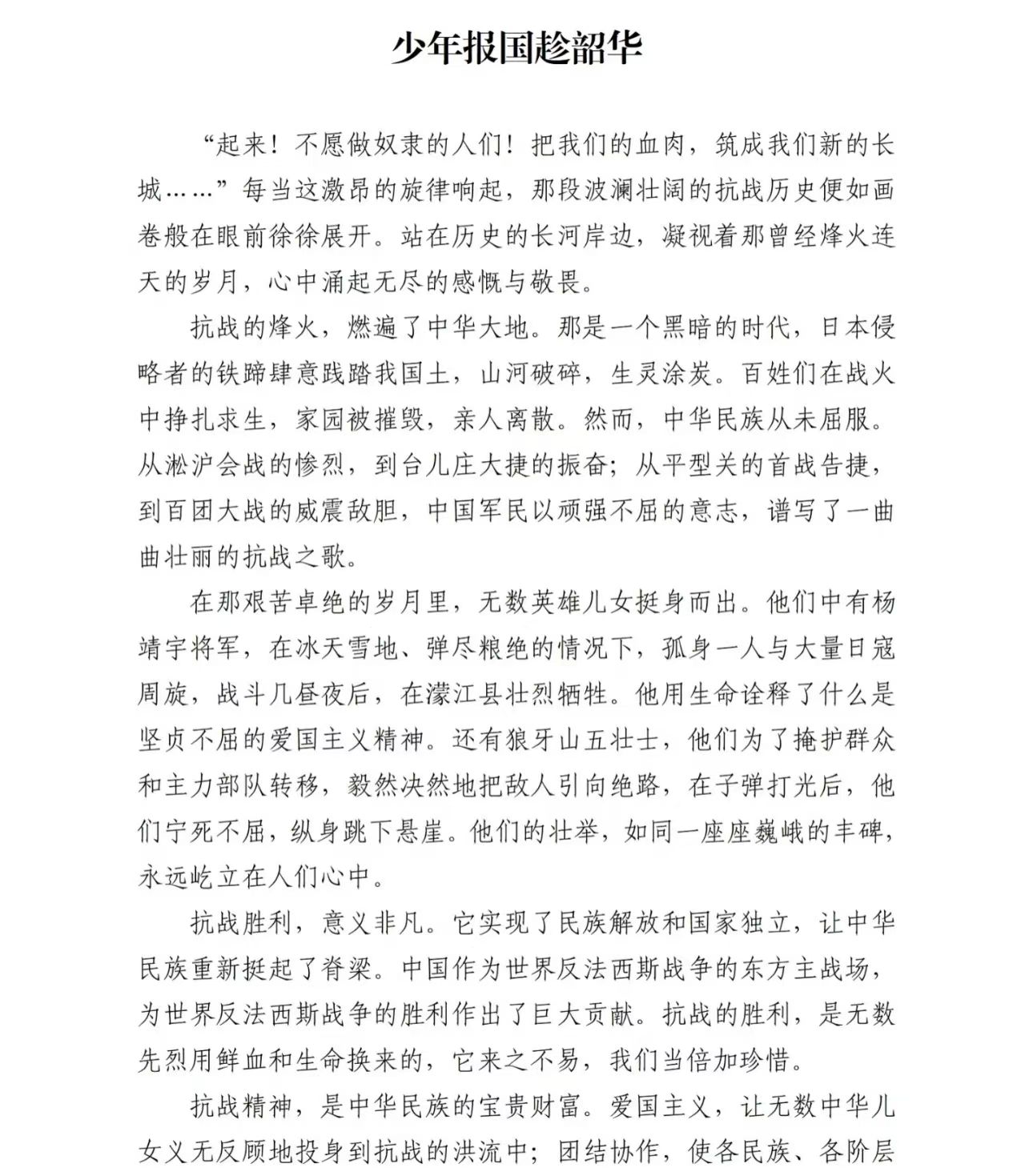 征文比赛 ,同学们积极响应,踊跃投稿,这些文章体裁丰富,有议论文深刻剖析历史事件的影响与教训;有散文饱含深情地缅怀先烈、抒发对和平的向往;还有记叙文生动再现历史片段,字里行间都是对历史的敬畏。有的同学说,读这些文章,就像经历了一场历史的洗礼;还有同学表示,激发了自己深入探究历史的兴趣。这次征文比赛,用文字承载历史记忆,让同学们在创作与阅读中铭记历史,意义深远。