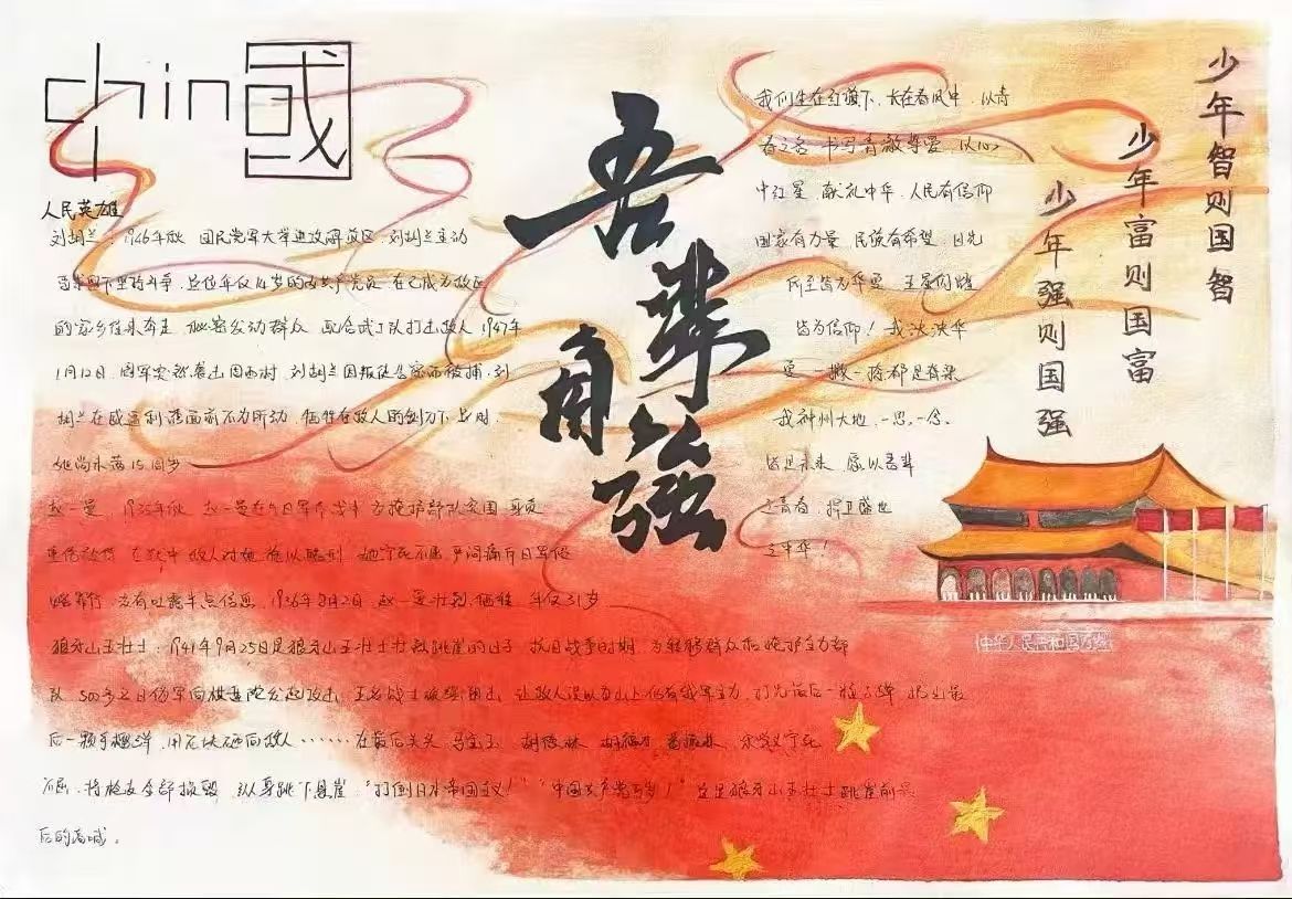 在手抄报比赛中同学们的参与热情超乎想象,从内容上看,同学们紧扣历史主题,有的同学再现战争场景展现先烈英勇事迹,也有描绘和平愿景、反思历史教训的。大家把对历史的思考和感悟融入色彩与线条中此活动不仅给同学们提供了展示创意的舞台,还加深了大家对历史的铭记,真正达到了“回溯历史 警钟长鸣”的目的。
