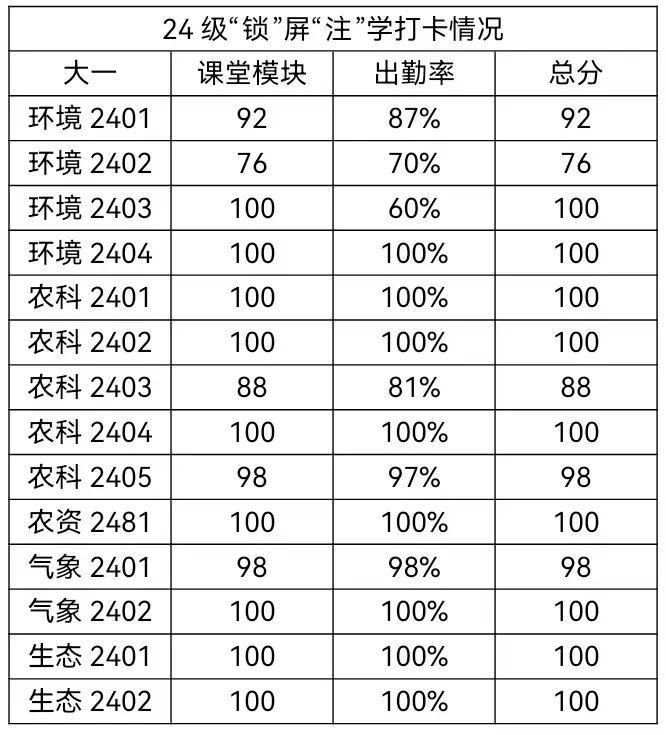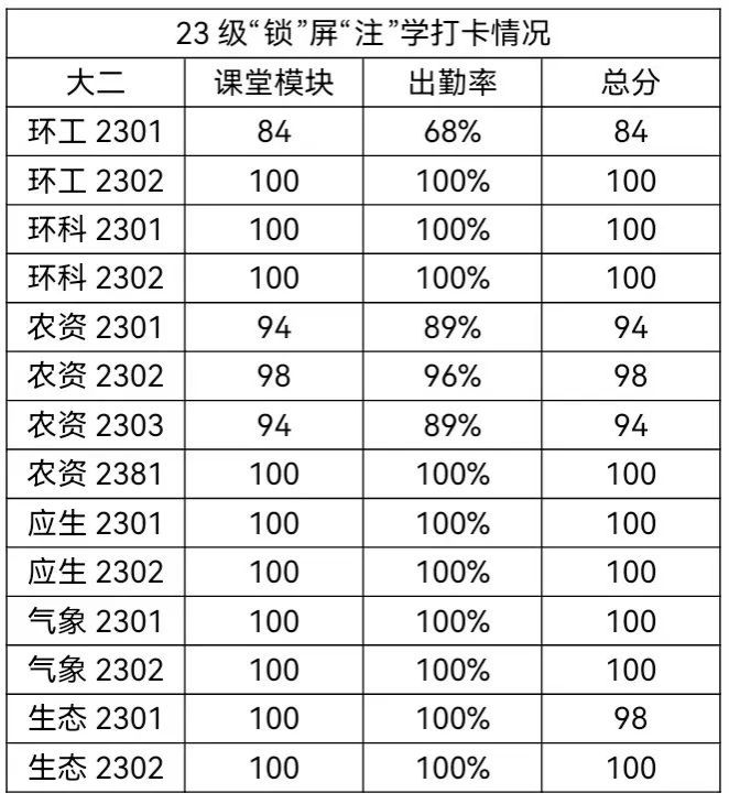 本周是开展“锁”屏“注”学课堂的第九周,总体签到情况较为良好,锁屏情况优秀,希望同学们提高对于“锁”屏“注”学重视程度,在未来的学习生活中能继续努力。