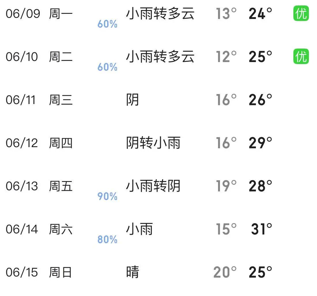 未来一周天气多为小雨或阴天,太阳出现频率低,只有周日一天为晴天,建议从周一到周六随身携带雨具。未来一周气温较上周有轻微上升,但最高气温基本上仍低于三十摄氏度,建议依据自己身体情况调整衣物增减并做好防晒措施。风力与湿度较上周而言没有明显变化,其中周一、周二的风力高达4级,建议在这两天减少外出活动时间与次数。