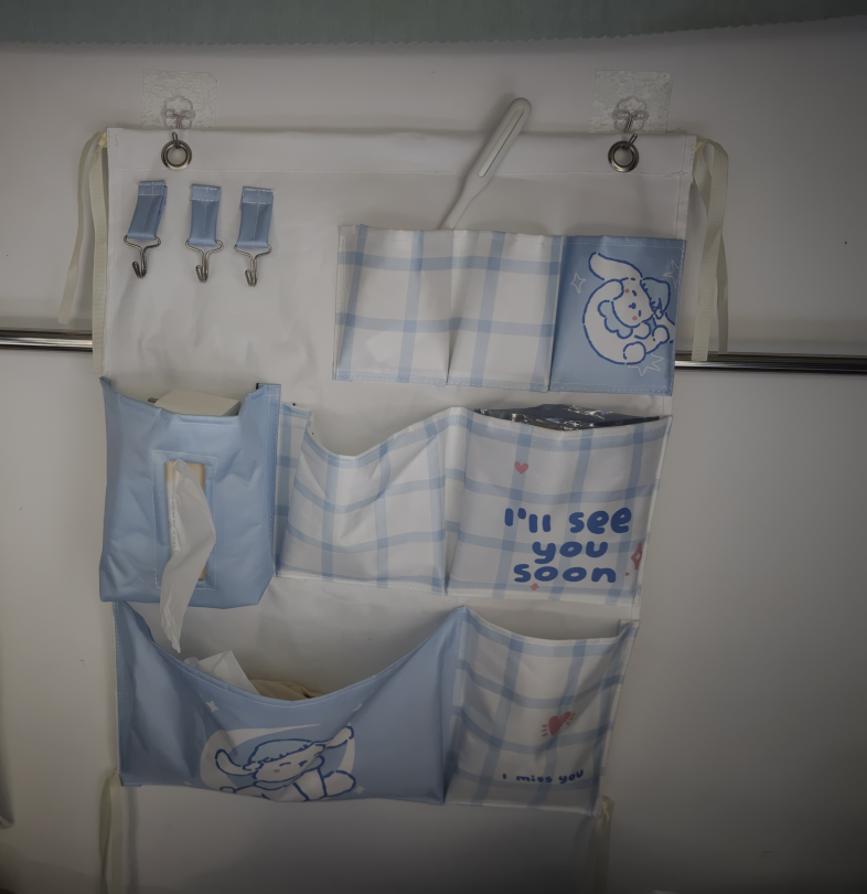 多个口袋分区存放纸巾、钥匙、发圈等零碎物品,取用一目了然。悬挂式设计不占桌面/地面,床边、衣柜旁随挂随用,告别宿舍杂乱。蓝白清新配色+可爱图案,为单调寝室增添温馨感,实用与美观兼具。