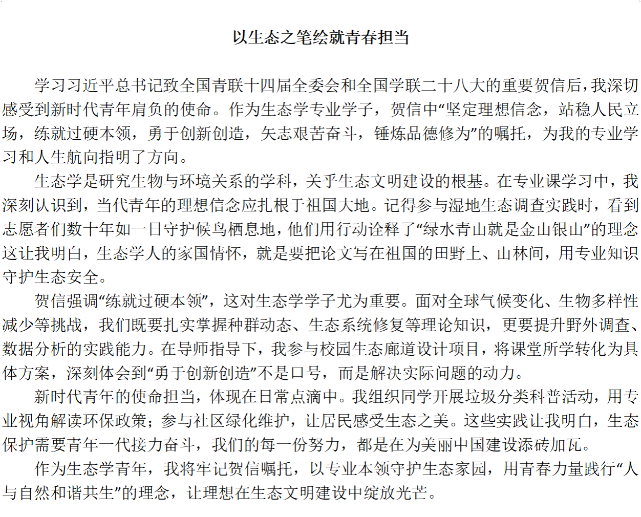 本次征文活动中,同学们的来稿紧扣主题,从不同角度阐述对学联二十八大精神的感悟。有的同学在文章里讲述学习习近平新时代中国特色社会主义思想的收获,坚定理想信念,筑牢信仰之基;有的结合自身经历,分享在社会实践、志愿服务中践行使命担当的故事,展现新时代青年的奉献精神;还有的探讨如何将个人成长与国家发展紧密相连,以实际行动为强国建设贡献力量 。这些文字,饱含着同学们对党和国家的热爱,对学联事业的关注,对自身成长的思考。